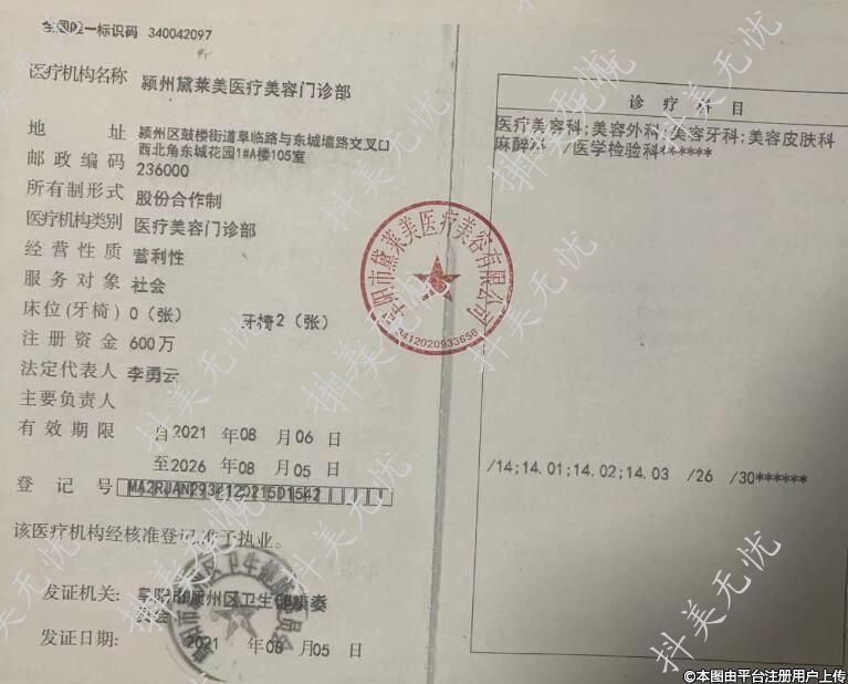 醫(yī)療機構名稱:潁州黛萊美醫(yī)療美容門診部