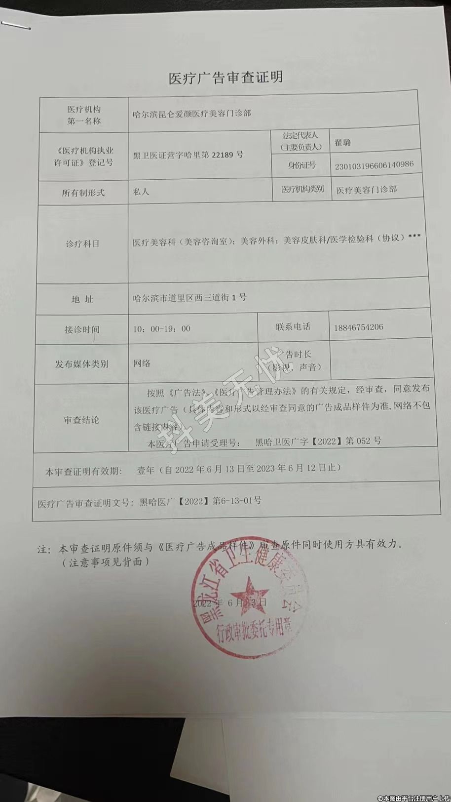 發(fā)證機關(guān):哈爾濱市道里區(qū)衛(wèi)生健康局