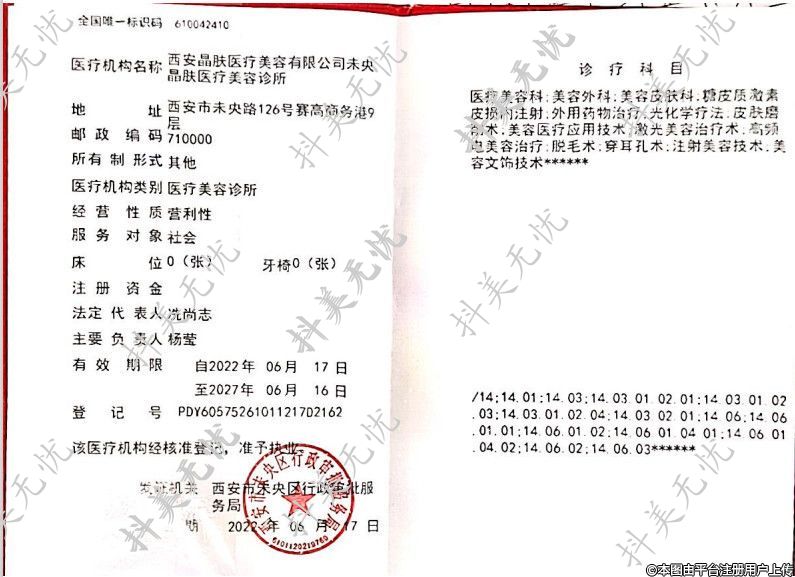 醫(yī)療機構名稱:西安晶膚醫(yī)療美容有限公司未央鐵醫(yī)療關容診所