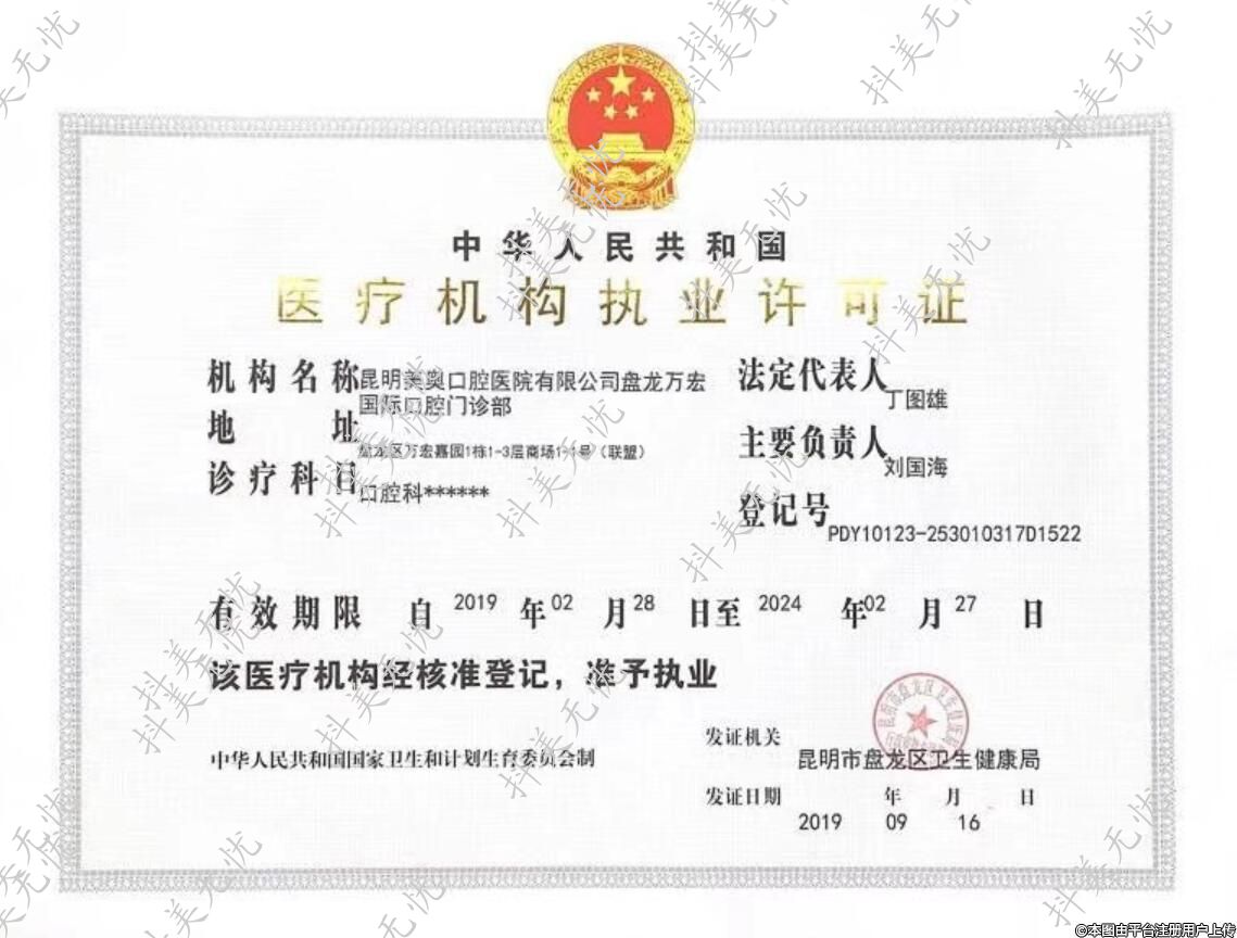 機(jī)構(gòu)名稱(chēng):昆明美奧口腔醫(yī)院有限公司盤(pán)龍萬(wàn)宏國(guó)際口腔門(mén)診部