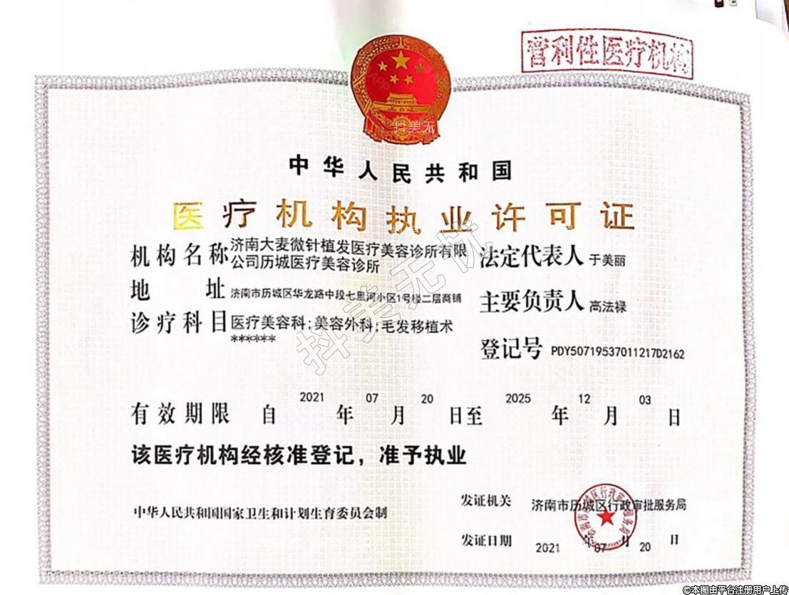 機構(gòu)名稱:濟南大麥微針植發(fā)醫(yī)療美容診所有限公司歷城醫(yī)療美容診所