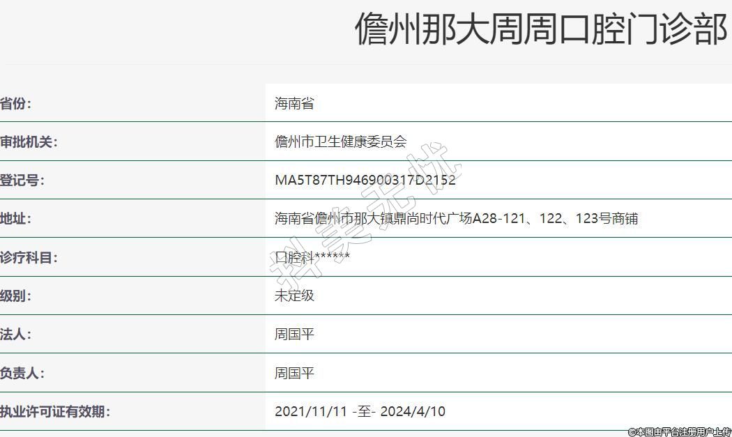 儋州那大周周口腔診所,從2021年已正式變更為儋州那大周周口腔門診部,店內(nèi)的醫(yī)療設(shè)備、醫(yī)療技術(shù)也隨之升級(jí),目前在儋州市共開設(shè)有兩家口腔醫(yī)療機(jī)構(gòu)。