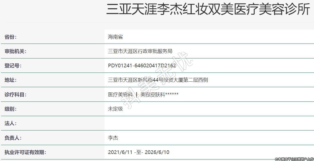 三亞天涯李杰紅妝雙美醫(yī)療美容2021-06-21成立,地址:三亞市天涯區(qū)新風(fēng)街44號投資大廈第二層西側(cè),診療科目:醫(yī)療美容科 | 美容皮膚科******