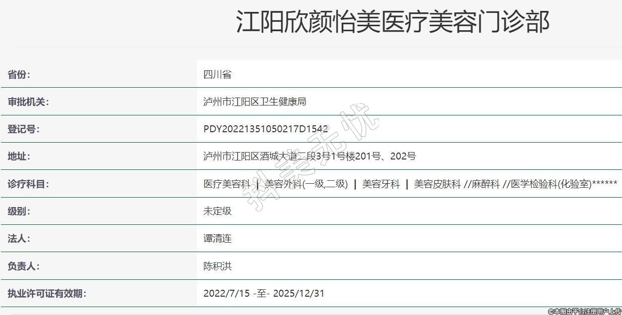 瀘州欣顏怡美醫(yī)療美容地址:瀘州市江陽區(qū)酒城大道二段3號1號樓201號、202號,診療科目:醫(yī)療美容科 | 美容外科(一級,二級) | 美容牙科 | 美容皮膚科 //麻醉科 //醫(yī)學(xué)檢驗科(化驗室)******