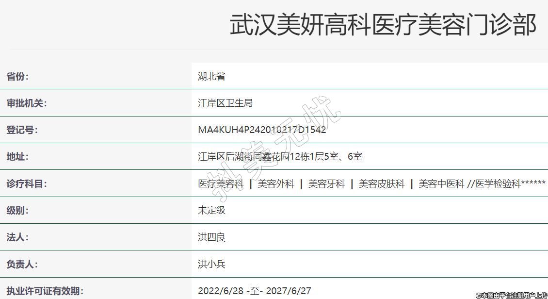 武漢美妍高科醫(yī)療美容2017-05-27成立,地址:江岸區(qū)后湖街同鑫花園12棟1層5室、6室,診療科目:醫(yī)療美容科 | 美容外科 | 美容牙科 | 美容皮膚科 | 美容中醫(yī)科 //醫(yī)學(xué)檢驗(yàn)科******