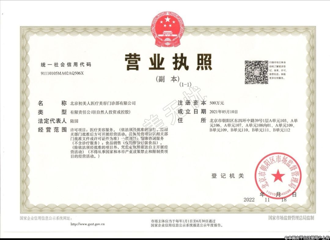 北京初美人醫(yī)療美容門診部有限公司,成立于2021-05-10,診療科目:醫(yī)療美容科 | 美容外科 | 美容牙科 | 美容皮膚科 //醫(yī)學(xué)檢驗科 | 臨床體液、血液專業(yè) | 臨床化學(xué)檢驗專業(yè) | 臨床免疫、血清學(xué)專業(yè)******