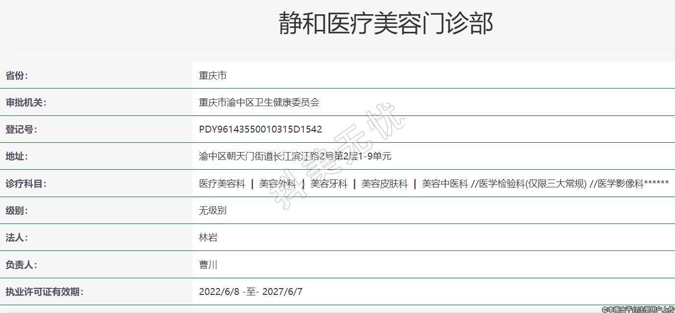 重慶靜和醫(yī)療美容2021年09月22日成立,地址:渝中區(qū)朝天門街道長江濱江路2號第2層1-9單元,診療科目:醫(yī)療美容科 | 美容外科 | 美容牙科 | 美容皮膚科 | 美容中醫(yī)科 //醫(yī)學(xué)檢驗科(僅限三大常規(guī)) //醫(yī)學(xué)影像科******