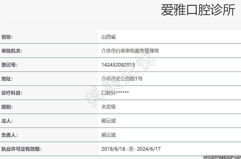 介休愛(ài)雅口腔2019年07月05日成立,地址:介休市史公西路1號(hào),診療科目:口腔科******