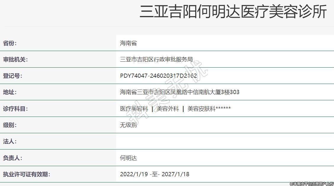三亞何明達醫(yī)療美容2022-03-16成立,地址:海南省三亞市吉陽區(qū)鳳凰路中信南航大廈3樓303,診療科目:醫(yī)療美容科 | 美容外科 | 美容皮膚科******