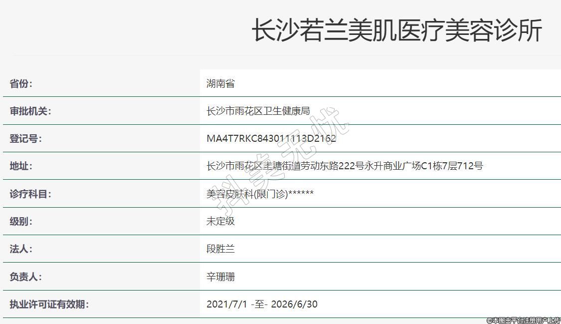 長沙若蘭美肌醫(yī)療美容2021年04月02日成立,地址:長沙市雨花區(qū)圭塘街道勞動?xùn)|路222號永升商業(yè)廣場C1棟7層712號,診療科目:美容皮膚科(限門診)******