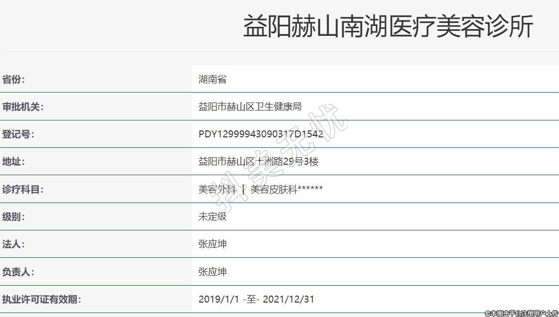 益陽(yáng)赫山南湖醫(yī)療美容診所,成立于2017-12-06,位于益陽(yáng)市赫山區(qū)十洲路29號(hào)三樓,診療科目:美容外科 | 美容皮膚科******