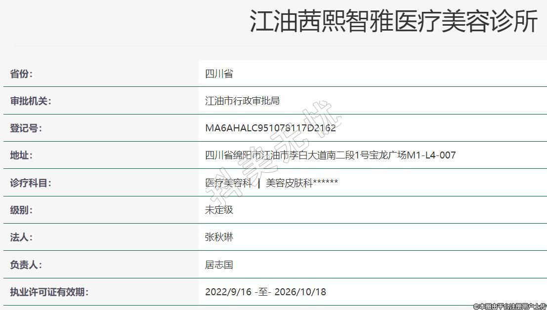 綿陽茜熙智雅醫(yī)療美容2021年07月06日,地址:四川省綿陽市江油市李白大道南二段1號寶龍廣場M1-L4-007,診療科目:醫(yī)療美容科 | 美容皮膚科******