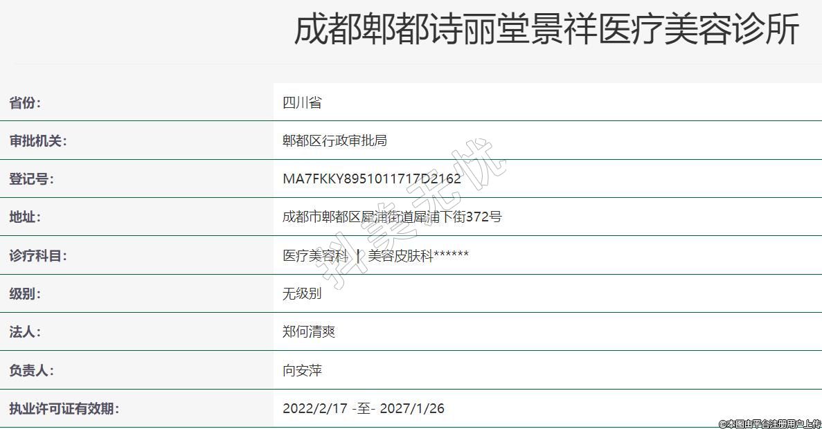 成都詩麗堂景祥醫(yī)療美容2022年01月04日成立,地址:成都市郫都區(qū)犀浦街道犀浦下街372號,診療科目:醫(yī)療美容科 | 美容皮膚科******