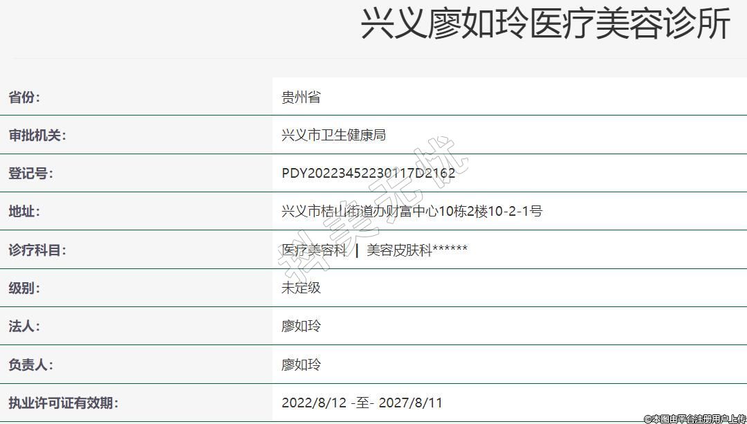 興義廖如玲醫(yī)療美容地址:興義市桔山街道辦財(cái)富中心10棟2樓10-2-1號,診療科目:醫(yī)療美容科 | 美容皮膚科******