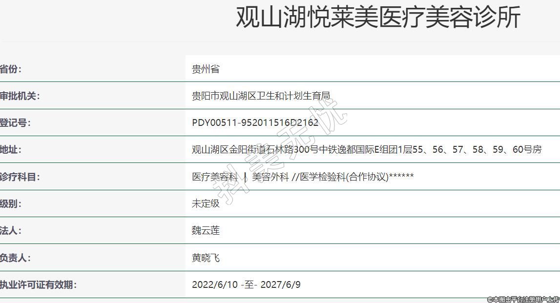 貴陽悅?cè)R美醫(yī)療美容2021年12月15日成立,地址:觀山湖區(qū)金陽街道石林路300號中鐵逸都國際E組團1層55、56、57、58、59、60號房,診療科目:醫(yī)療美容科 | 美容外科 //醫(yī)學檢驗科(合作協(xié)議)******