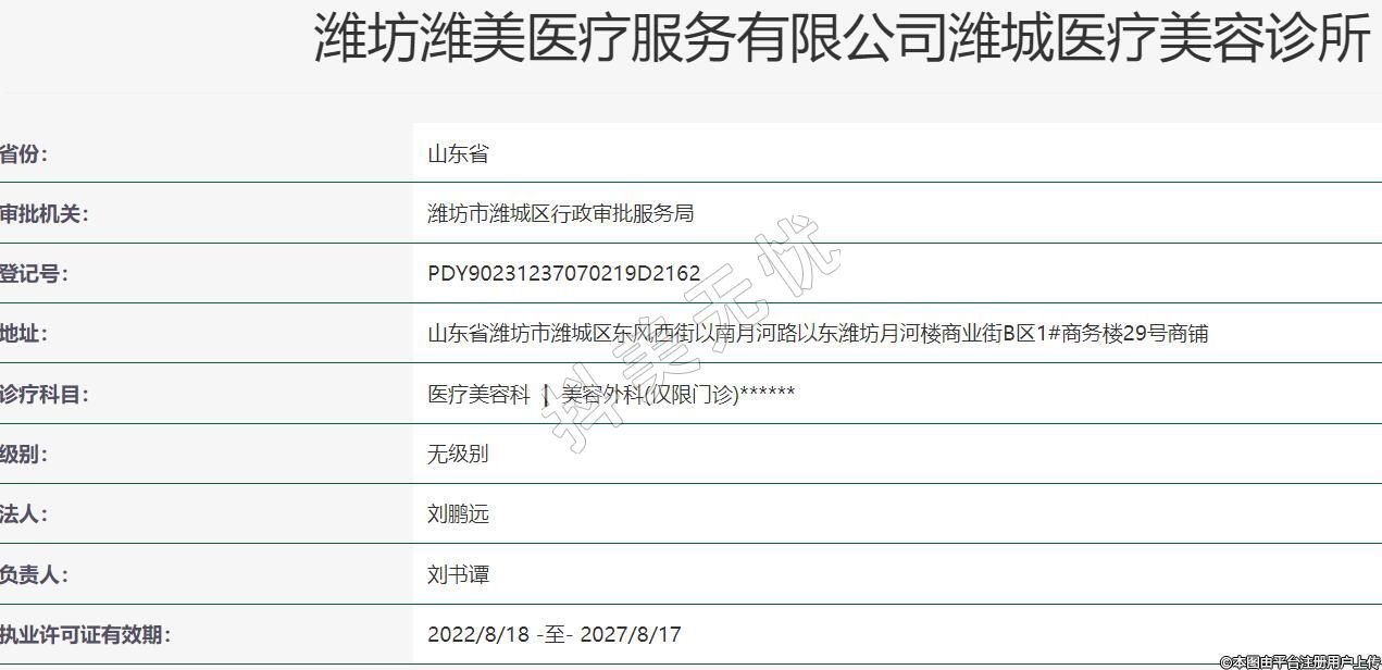 濰坊濰美醫(yī)療美容2022-07-06成立,地址:山東省濰坊市濰城區(qū)東風(fēng)西街以南月河路以東濰坊月河樓商業(yè)街B區(qū)1#商務(wù)樓29號商鋪,診療科目:醫(yī)療美容科 | 美容外科(僅限門診)******