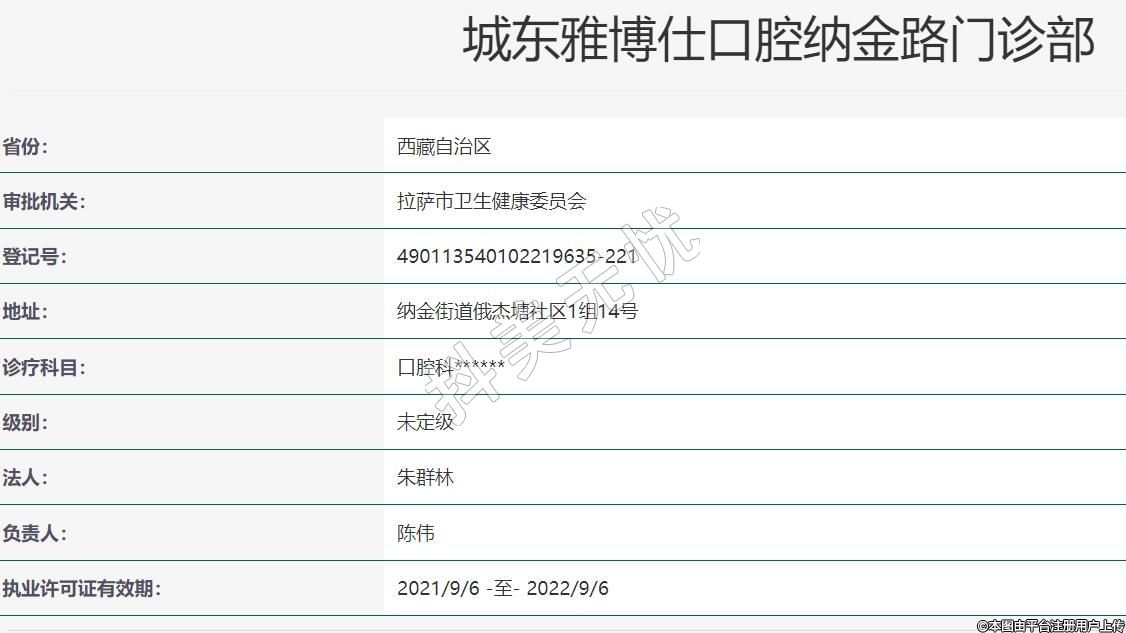 拉薩雅博仕口腔(納金路)2020年10月20日成立,地址:納金街道俄杰塘社區(qū)1組14號(hào),診療科目:口腔科******