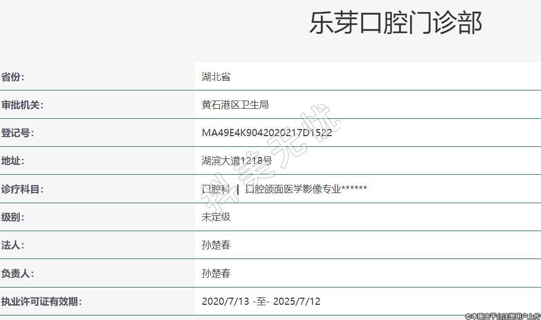 黃石樂芽口腔2019年12月31日成立,地址:湖濱大道1218號(hào),診療科目:口腔科 | 口腔頜面醫(yī)學(xué)影像專業(yè)******