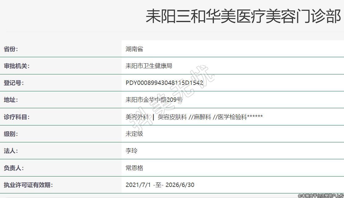 耒陽三和華美醫(yī)療美容2017年04月14日成立,地址:耒陽市金華中路209號(hào),診療科目:美容外科 | 美容皮膚科 //麻醉科 //醫(yī)學(xué)檢驗(yàn)科******