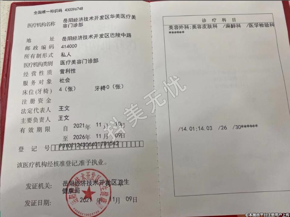 醫(yī)療機(jī)構(gòu)名稱:岳陽(yáng)經(jīng)濟(jì)技術(shù)開(kāi)發(fā)區(qū)華美醫(yī)療美容門(mén)診部