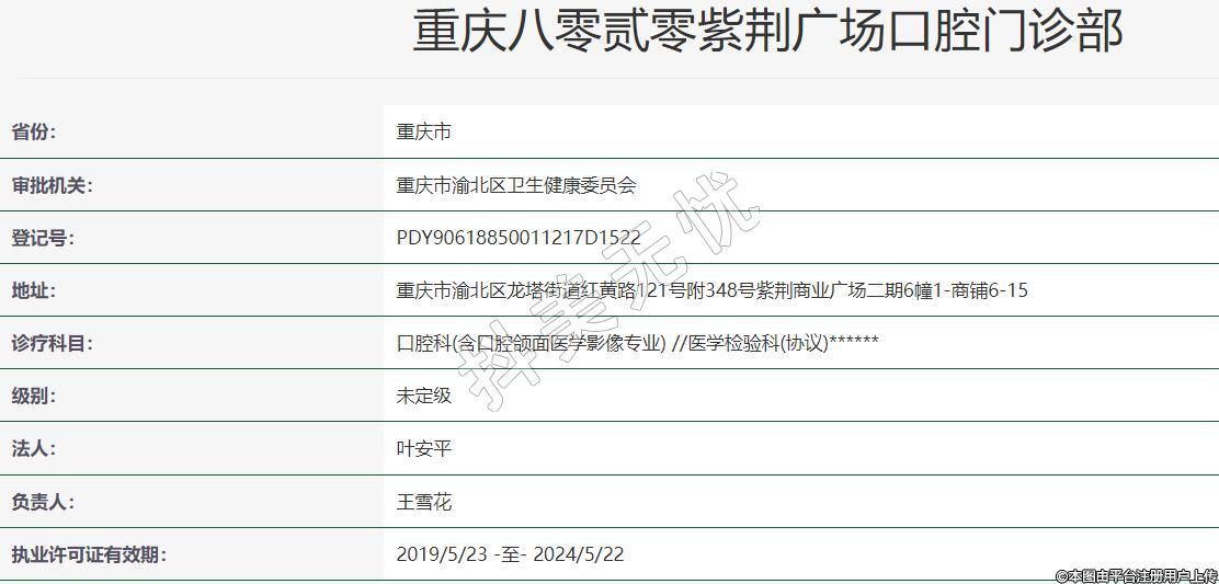 重慶八零貳零紫荊廣場口腔2019-03-27成立,地址:重慶市渝北區(qū)龍塔街道紅黃路121號附348號紫荊商業(yè)廣場二期6幢1-商鋪6-15,診療科目:口腔科(含口腔頜面醫(yī)學影像專業(yè)) //醫(yī)學檢驗科(協(xié)議)******