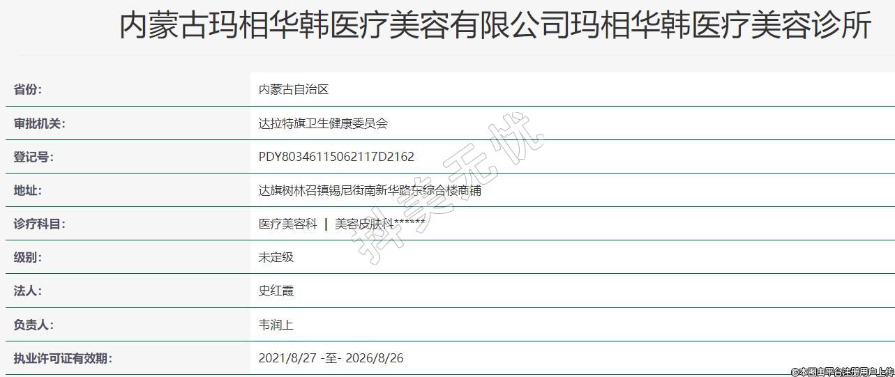 內(nèi)蒙古瑪相華韓醫(yī)療美容(瑪相)2021-08-19成立,地址:達旗樹林召鎮(zhèn)錫尼街南新華路東綜合樓商鋪,診療科目:醫(yī)療美容科 | 美容皮膚科******