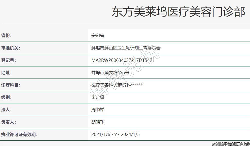 ?蚌埠東方美萊塢醫(yī)療美容2018-07-16成立,地址:蚌埠市延安路456號,診療科目:醫(yī)療美容科 //麻醉科******