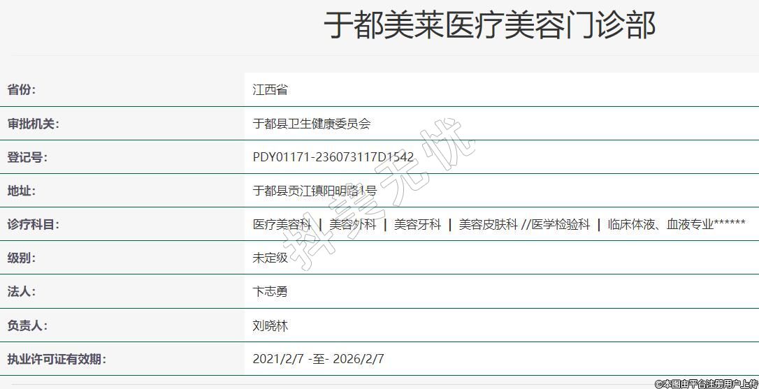 于都美萊醫(yī)療美容2020-11-21成立,診療科目:醫(yī)療美容科 | 美容外科 | 美容牙科 | 美容皮膚科 //醫(yī)學(xué)檢驗科 | 臨床體液、血液專業(yè)******