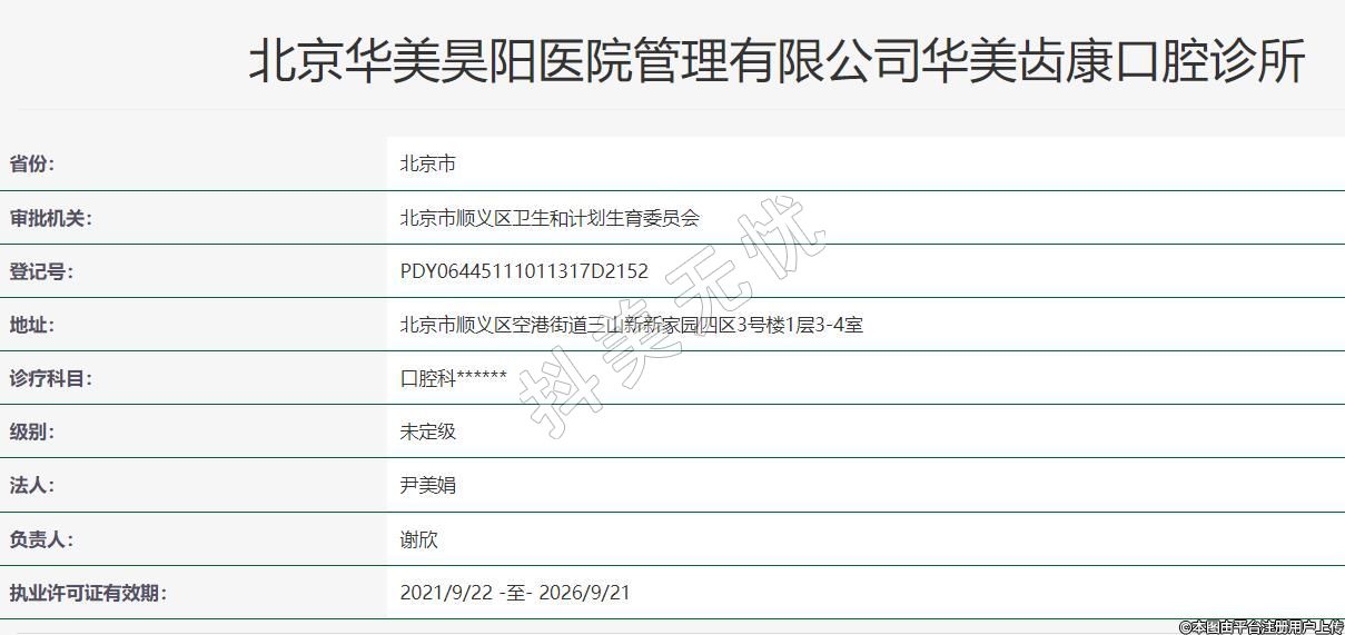 北京華美昊陽醫(yī)院管理有限公司華美齒康口腔診所