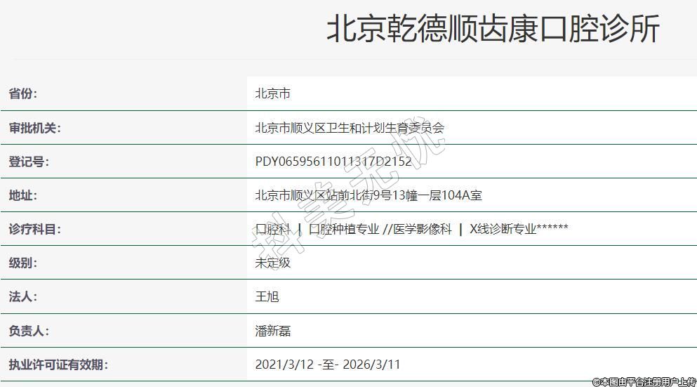 北京乾德順齒康口腔2020-10-12成立,地址:北京市順義區(qū)站前北街9號13幢一層104A室,診療科目:口腔科 | 口腔種植專業(yè) //醫(yī)學(xué)影像科 | X線診斷專業(yè)******