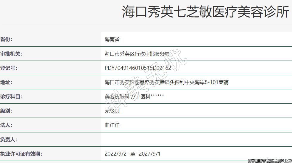 ??谄咧ッ翎t(yī)療美容2022-04-27成立,地址:??谑行阌^(qū)麗晶路秀英港碼頭保利中央海岸8-101商鋪,診療科目:美容皮膚科 //中醫(yī)科******