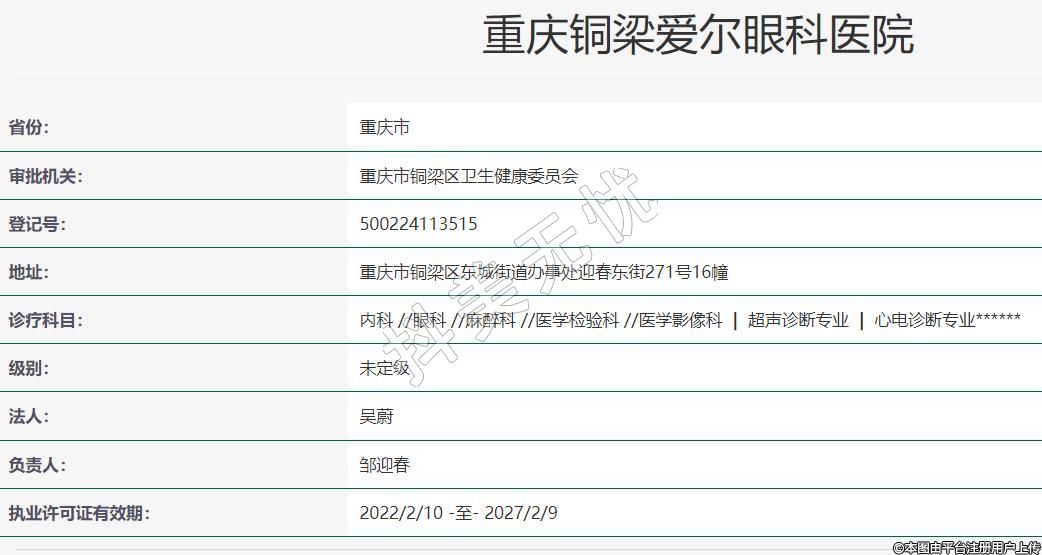 重慶銅梁愛爾眼科2017-09-05成立,地址:重慶市銅梁區(qū)東城街道辦事處迎春東街271號16幢,診療科目:內(nèi)科 //眼科 //麻醉科 //醫(yī)學(xué)檢驗(yàn)科 //醫(yī)學(xué)影像科 | 超聲診斷專業(yè) | 心電診斷專業(yè)******