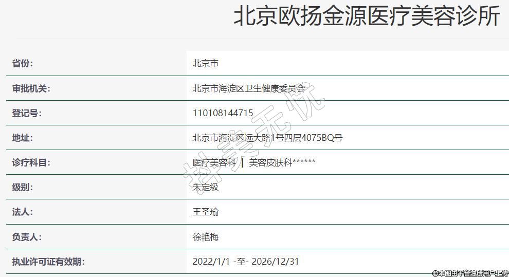 北京歐揚(yáng)金源醫(yī)療美容2017-06-30成立,地址:北京市海淀區(qū)遠(yuǎn)大路1號四層4075BQ號,診療科目:醫(yī)療美容科 | 美容皮膚科******