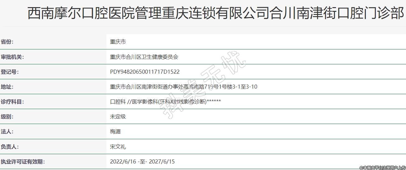 西南摩爾口腔2022-02-24成立,地址:重慶市合川區(qū)南津街街道辦事處嘉濱南路719號1號樓3-1至3-10,診療科目:口腔科 //醫(yī)學(xué)影像科(牙科X射線影像診斷)******