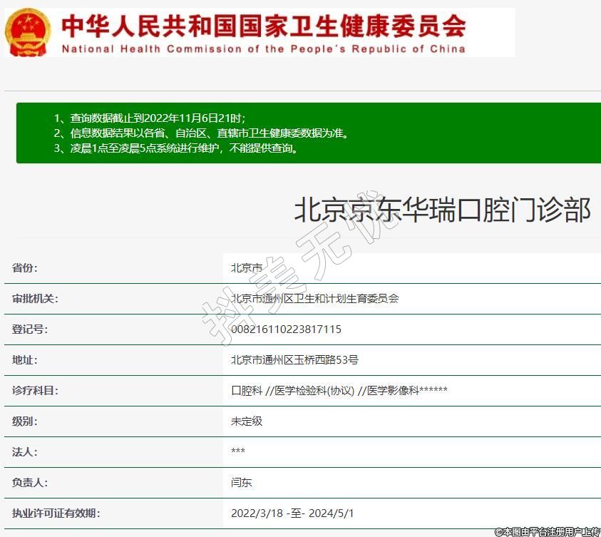 北京京東華瑞口腔2004-05-11成立,地址:北京市通州區(qū)玉橋西路53號,診療科目:口腔科 //醫(yī)學(xué)檢驗科(協(xié)議) //醫(yī)學(xué)影像科******