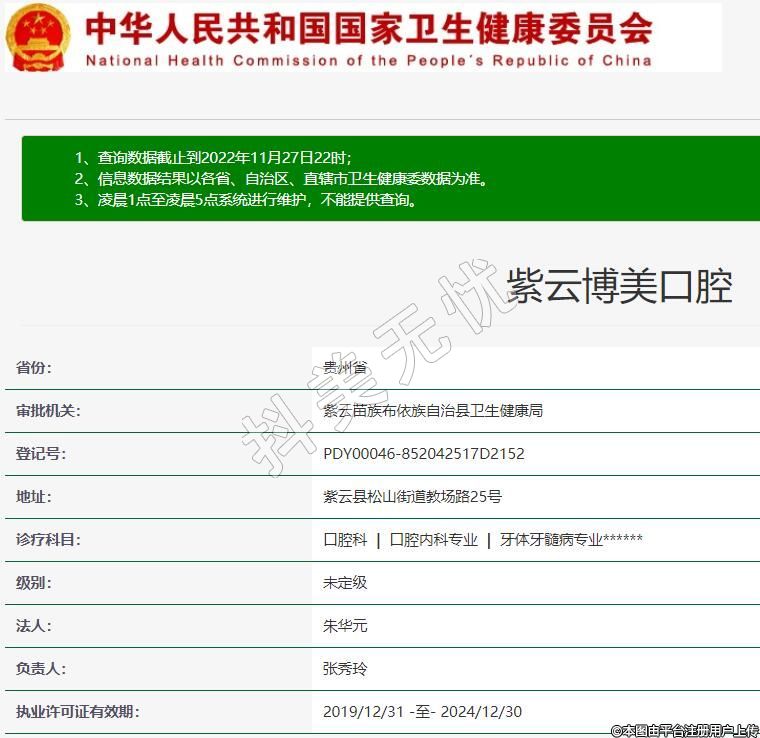 紫云博美口腔2018-01-11成立,地址:紫云縣松山街道教場路25號,診療科目:口腔科 | 口腔內(nèi)科專業(yè) | 牙體牙髓病專業(yè)******