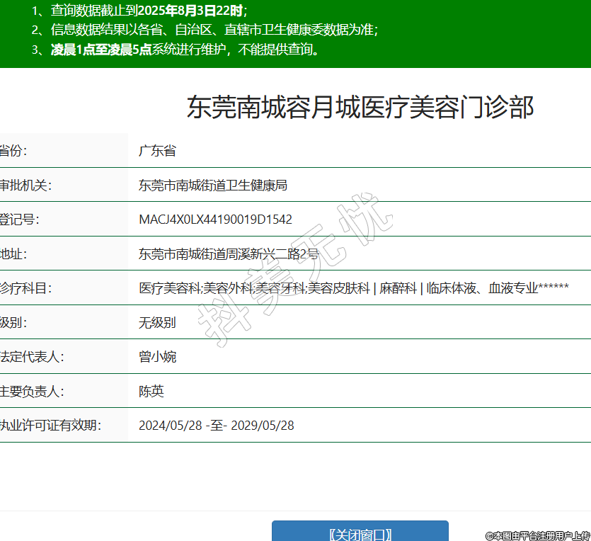 省份:廣東省審批機(jī)關(guān):東莞市南城街道衛(wèi)生健康局登記號:MACJ4X0LX44190019D1542地址:東莞市南城街道周溪新興二路2號診療科目:醫(yī)療美容科;美容外科;美容牙科;美容皮膚科 | 麻醉科 | 臨床體液、血液專業(yè)******級別:無級別法定代表人:曾小婉主要負(fù)責(zé)人:陳英執(zhí)業(yè)許可證有效期:2024/05/28 -至- 2029/05/28 -