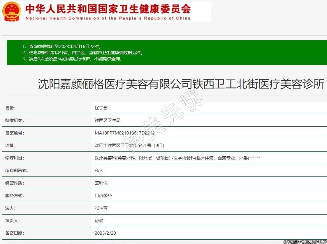沈陽嘉顏儷格醫(yī)療美容(鐵西衛(wèi)工北街)診療科目:醫(yī)療美容科(美容外科,限開展一級項目) /醫(yī)學檢驗科(臨床體液、血液專業(yè),外委)******