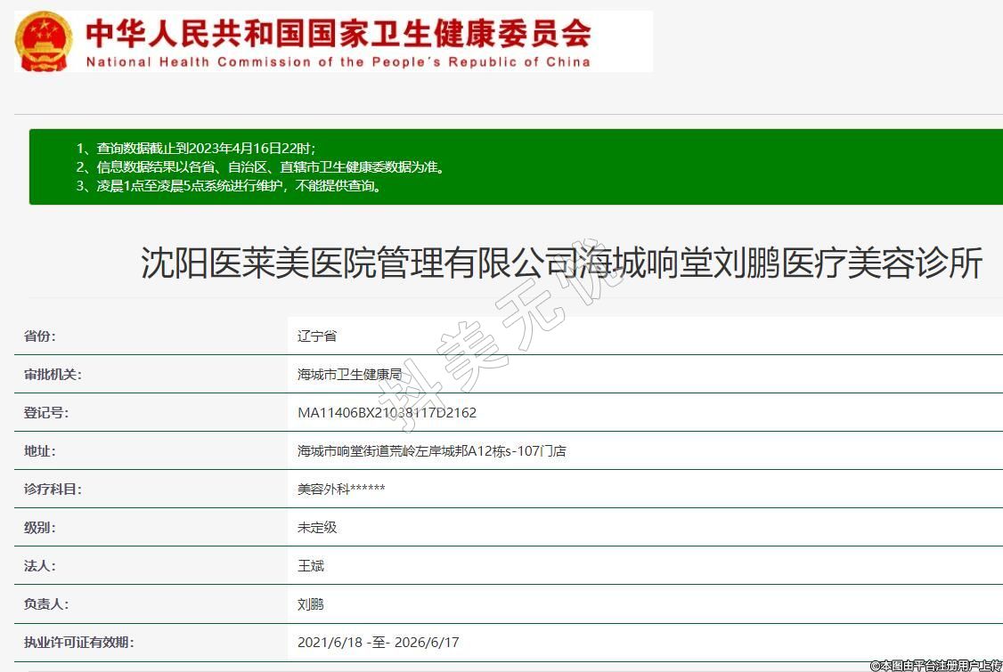 沈陽醫(yī)萊美醫(yī)院管理有限公司海城響堂劉鵬醫(yī)療美容診所