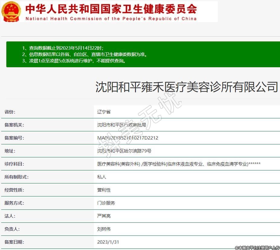 沈陽雍禾醫(yī)療美容,診療科目:醫(yī)療美容科(美容外科) /醫(yī)學(xué)檢驗(yàn)科(臨床體液血液專業(yè)、臨床免疫血清學(xué)專業(yè))******