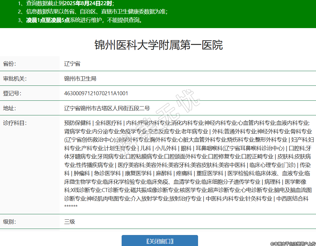 省份:遼寧省審批機(jī)關(guān):錦州市衛(wèi)生局登記號:46300097121070211A1001地址:遼寧省錦州市古塔區(qū)人民街五段二號診療科目:預(yù)防保健科 | 全科醫(yī)療科 | 內(nèi)科;呼吸內(nèi)科專業(yè);消化內(nèi)科專業(yè);神經(jīng)內(nèi)科專業(yè);心血管內(nèi)科專業(yè);血液內(nèi)科專業(yè);腎病學(xué)專業(yè);內(nèi)分泌專業(yè);免疫學(xué)專業(yè);變態(tài)反應(yīng)專業(yè);老年病專業(yè) | 外科;普通外科專業(yè);神經(jīng)外科專業(yè);骨科專業(yè)(遼寧省創(chuàng)傷救治中心);泌尿外科專業(yè);胸外科專業(yè);心臟大血管外科專業(yè);燒傷科專業(yè);整形外科專業(yè) | 婦產(chǎn)科;婦科專業(yè);產(chǎn)科專業(yè);計(jì)劃生育專業(yè) | 兒科 | 小兒外科 | 眼科 | 耳鼻咽喉科(遼寧省耳鼻喉科診治中心) | 口腔科;牙體牙髓病專業(yè);牙周病專業(yè);口腔粘膜病專業(yè);口腔頜面外科專業(yè);口腔修復(fù)專業(yè);口腔正畸專業(yè) | 皮膚科;皮膚病專業(yè);性傳播疾病專業(yè) | 醫(yī)療美容科;美容外科;美容牙科;美容皮膚科;美容中醫(yī)科 | 臨床心理專業(yè)(門診) | 傳染科 | 腫瘤科 | 急診醫(yī)學(xué)科 | 康復(fù)醫(yī)學(xué)科 | 麻醉科 | 疼痛科 | 重癥醫(yī)學(xué)科 | 醫(yī)學(xué)檢驗(yàn)科;臨床體液、血液專業(yè);臨床微生物學(xué)專業(yè);臨床化學(xué)檢驗(yàn)專業(yè);臨床免疫、血清學(xué)專業(yè);臨床細(xì)胞分子遺傳學(xué)專業(yè) | 病理科 | 醫(yī)學(xué)影像科;X線診斷專業(yè);CT診斷專業(yè);磁共振成像診斷專業(yè);核醫(yī)學(xué)專業(yè);超聲診斷專業(yè);心電診斷專業(yè);腦電及腦血流圖診斷專業(yè);神經(jīng)肌肉電圖專業(yè);介入放射學(xué)專業(yè);放射治療專業(yè) | 中醫(yī)科;內(nèi)科專業(yè);針灸科專業(yè) | 中西醫(yī)結(jié)合科******級別:三級法定代表人:郜玉忠主要負(fù)責(zé)人:姜華茂執(zhí)業(yè)許可證有效期:2018/02/02 -至- 2033/02/01 -