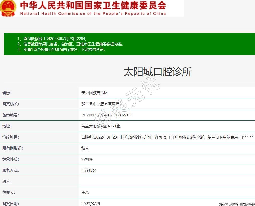 診療科目:口腔科(2022年3月23日核準(zhǔn)放射診療許可,許可項(xiàng)目 牙科X射線影像診斷。賀蘭縣衛(wèi)生健康局。)******