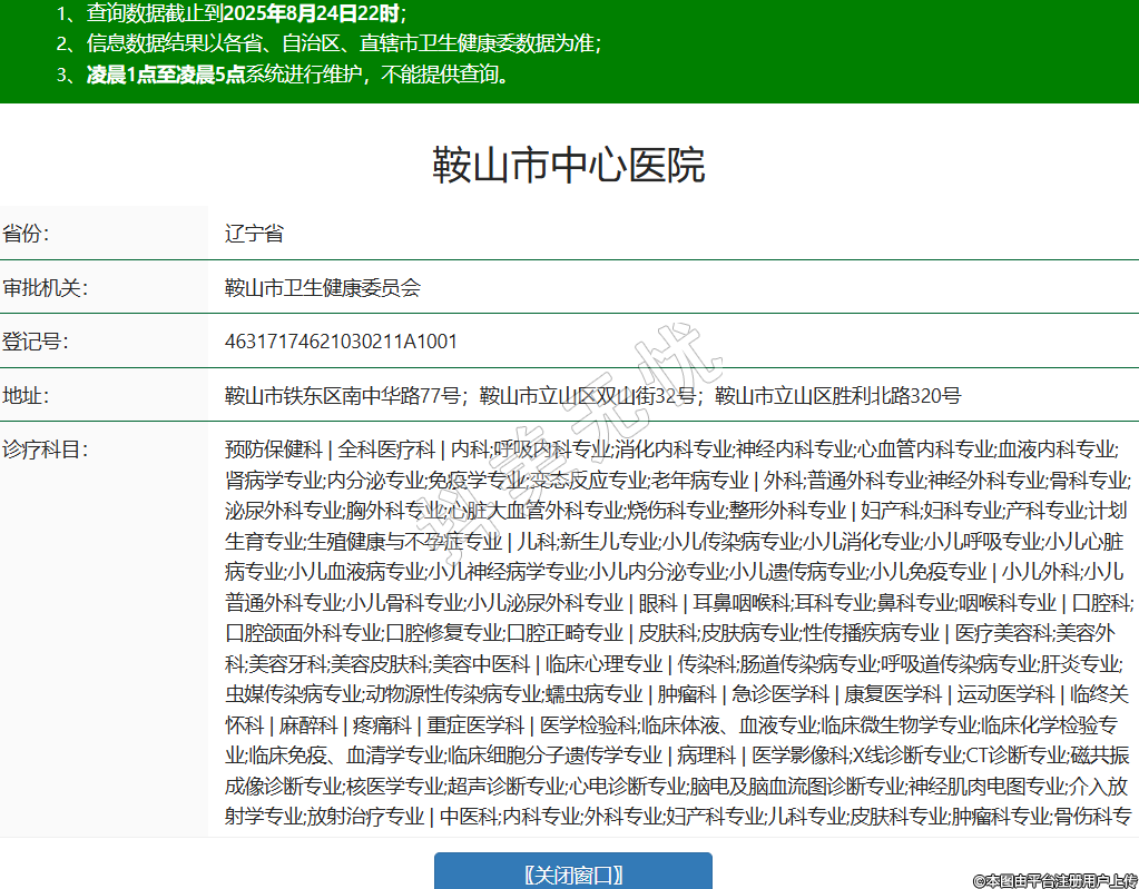 省份:遼寧省審批機(jī)關(guān):鞍山市衛(wèi)生健康委員會(huì)登記號(hào):46317174621030211A1001地址:鞍山市鐵東區(qū)南中華路77號(hào);鞍山市立山區(qū)雙山街32號(hào);鞍山市立山區(qū)勝利北路320號(hào)診療科目:預(yù)防保健科 | 全科醫(yī)療科 | 內(nèi)科;呼吸內(nèi)科專業(yè);消化內(nèi)科專業(yè);神經(jīng)內(nèi)科專業(yè);心血管內(nèi)科專業(yè);血液內(nèi)科專業(yè);腎病學(xué)專業(yè);內(nèi)分泌專業(yè);免疫學(xué)專業(yè);變態(tài)反應(yīng)專業(yè);老年病專業(yè) | 外科;普通外科專業(yè);神經(jīng)外科專業(yè);骨科專業(yè);泌尿外科專業(yè);胸外科專業(yè);心臟大血管外科專業(yè);燒傷科專業(yè);整形外科專業(yè) | 婦產(chǎn)科;婦科專業(yè);產(chǎn)科專業(yè);計(jì)劃生育專業(yè);生殖健康與不孕癥專業(yè) | 兒科;新生兒專業(yè);小兒傳染病專業(yè);小兒消化專業(yè);小兒呼吸專業(yè);小兒心臟病專業(yè);小兒血液病專業(yè);小兒神經(jīng)病學(xué)專業(yè);小兒內(nèi)分泌專業(yè);小兒遺傳病專業(yè);小兒免疫專業(yè) | 小兒外科;小兒普通外科專業(yè);小兒骨科專業(yè);小兒泌尿外科專業(yè) | 眼科 | 耳鼻咽喉科;耳科專業(yè);鼻科專業(yè);咽喉科專業(yè) | 口腔科;口腔頜面外科專業(yè);口腔修復(fù)專業(yè);口腔正畸專業(yè) | 皮膚科;皮膚病專業(yè);性傳播疾病專業(yè) | 醫(yī)療美容科;美容外科;美容牙科;美容皮膚科;美容中醫(yī)科 | 臨床心理專業(yè) | 傳染科;腸道傳染病專業(yè);呼吸道傳染病專業(yè);肝炎專業(yè);蟲媒傳染病專業(yè);動(dòng)物源性傳染病專業(yè);蠕蟲病專業(yè) | 腫瘤科 | 急診醫(yī)學(xué)科 | 康復(fù)醫(yī)學(xué)科 | 運(yùn)動(dòng)醫(yī)學(xué)科 | 臨終關(guān)懷科 | 麻醉科 | 疼痛科 | 重癥醫(yī)學(xué)科 | 醫(yī)學(xué)檢驗(yàn)科;臨床體液、血液專業(yè);臨床微生物學(xué)專業(yè);臨床化學(xué)檢驗(yàn)專業(yè);臨床免疫、血清學(xué)專業(yè);臨床細(xì)胞分子遺傳學(xué)專業(yè) | 病理科 | 醫(yī)學(xué)影像科;X線診斷專業(yè);CT診斷專業(yè);磁共振成像診斷專業(yè);核醫(yī)學(xué)專業(yè);超聲診斷專業(yè);心電診斷專業(yè);腦電及腦血流圖診斷專業(yè);神經(jīng)肌肉電圖專業(yè);介入放射學(xué)專業(yè);放射治療專業(yè) | 中醫(yī)科;內(nèi)科專業(yè);外科專業(yè);婦產(chǎn)科專業(yè);兒科專業(yè);皮膚科專業(yè);腫瘤科專業(yè);骨傷科專業(yè);肛腸科專業(yè);老年病科專業(yè);針灸科專業(yè);康復(fù)醫(yī)學(xué)專業(yè) | 中西醫(yī)結(jié)合科******級(jí)別:三級(jí)法定代表人:蔡鵬主要負(fù)責(zé)人:執(zhí)業(yè)許可證有效期:2024/12/17 -至- 2033/06/30 -