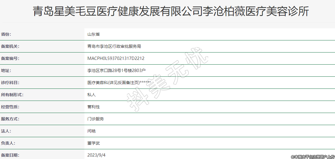 青島星美毛豆醫(yī)療健康發(fā)展有限公司李滄柏薇醫(yī)療美容診所