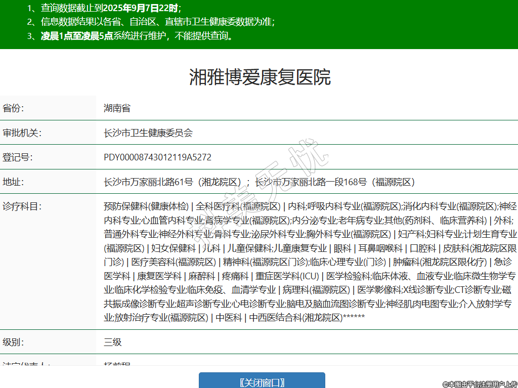 省份:湖南省審批機(jī)關(guān):長沙市衛(wèi)生健康委員會登記號:PDY00008743012119A5272地址:長沙市萬家麗北路61號(湘龍?jiān)簠^(qū));長沙市萬家麗北路一段168號(福源院區(qū))診療科目:預(yù)防保健科(健康體檢) | 全科醫(yī)療科(福源院區(qū)) | 內(nèi)科;呼吸內(nèi)科專業(yè)(福源院區(qū));消化內(nèi)科專業(yè)(福源院區(qū));神經(jīng)內(nèi)科專業(yè);心血管內(nèi)科專業(yè);腎病學(xué)專業(yè)(福源院區(qū));內(nèi)分泌專業(yè);老年病專業(yè);其他(藥劑科、臨床營養(yǎng)科) | 外科;普通外科專業(yè);神經(jīng)外科專業(yè);骨科專業(yè);泌尿外科專業(yè);胸外科專業(yè)(福源院區(qū)) | 婦產(chǎn)科;婦科專業(yè);計(jì)劃生育專業(yè)(福源院區(qū)) | 婦女保健科 | 兒科 | 兒童保健科;兒童康復(fù)專業(yè) | 眼科 | 耳鼻咽喉科 | 口腔科 | 皮膚科(湘龍?jiān)簠^(qū)限門診) | 醫(yī)療美容科(福源院區(qū)) | 精神科(福源院區(qū)門診);臨床心理專業(yè)(門診) | 腫瘤科(湘龍?jiān)簠^(qū)限化療) | 急診醫(yī)學(xué)科 | 康復(fù)醫(yī)學(xué)科 | 麻醉科 | 疼痛科 | 重癥醫(yī)學(xué)科(ICU) | 醫(yī)學(xué)檢驗(yàn)科;臨床體液、血液專業(yè);臨床微生物學(xué)專業(yè);臨床化學(xué)檢驗(yàn)專業(yè);臨床免疫、血清學(xué)專業(yè) | 病理科(福源院區(qū)) | 醫(yī)學(xué)影像科;X線診斷專業(yè);CT診斷專業(yè);磁共振成像診斷專業(yè);超聲診斷專業(yè);心電診斷專業(yè);腦電及腦血流圖診斷專業(yè);神經(jīng)肌肉電圖專業(yè);介入放射學(xué)專業(yè);放射治療專業(yè)(福源院區(qū)) | 中醫(yī)科 | 中西醫(yī)結(jié)合科(湘龍?jiān)簠^(qū))******級別:三級法定代表人:楊前程主要負(fù)責(zé)人:胡建中執(zhí)業(yè)許可證有效期:2025/08/20 -至- 2031/07/06 -