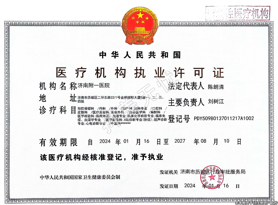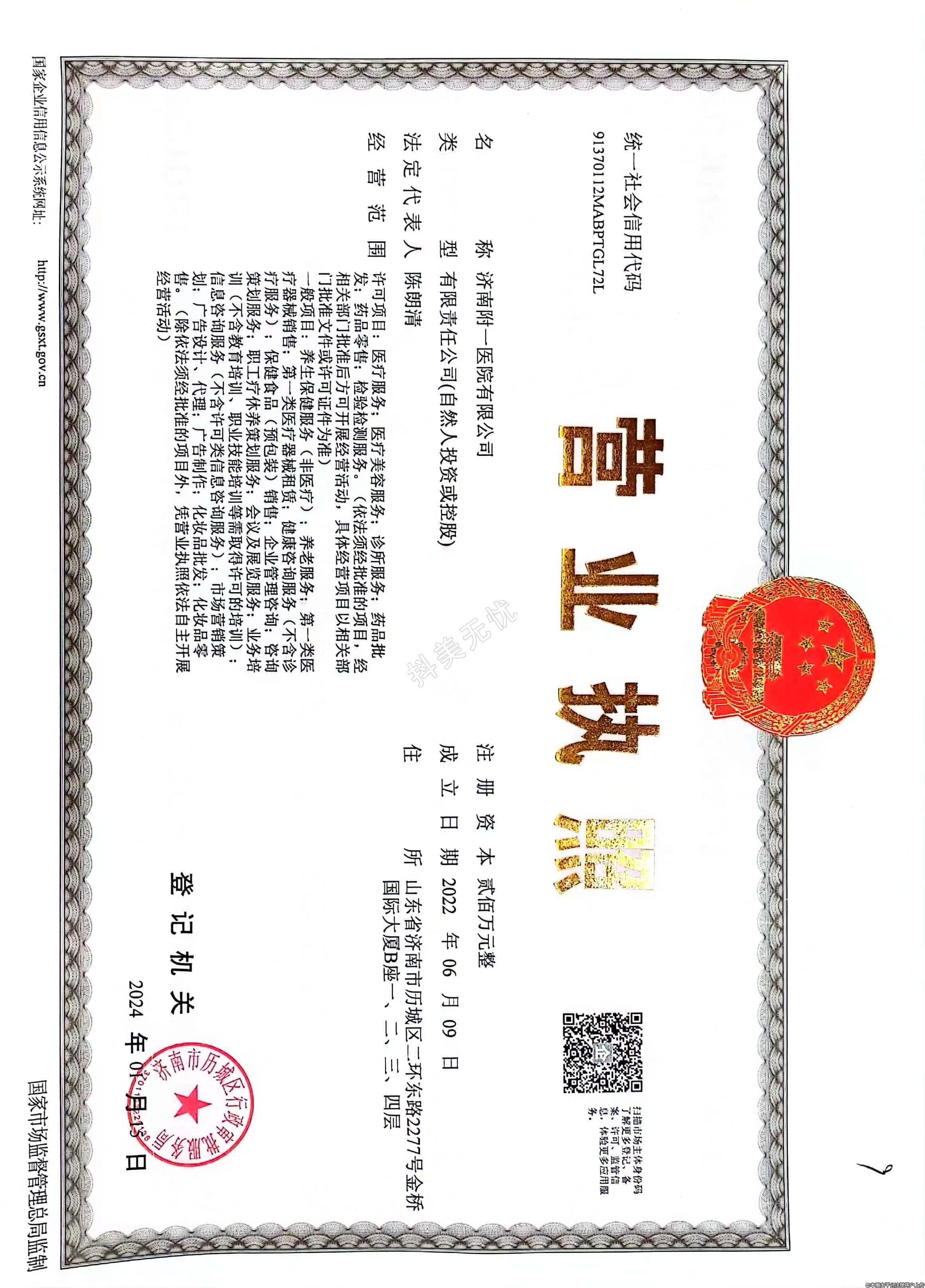濟(jì)南附一醫(yī)院成立于2022年6月9日,注冊地址位于濟(jì)南市歷城區(qū)二環(huán)東路2277號(hào)金橋國際大廈B座,初期注冊資本200萬元。醫(yī)院開設(shè)預(yù)防保健科、內(nèi)科、外科、婦產(chǎn)科、口腔科、皮膚科、醫(yī)療美容科、急診醫(yī)學(xué)科、麻醉科、醫(yī)學(xué)檢驗(yàn)科、醫(yī)學(xué)影像科、中醫(yī)科等臨床及醫(yī)技科室。2023年5月營業(yè)面積擴(kuò)展至四個(gè)樓層,2024年1月由原名濟(jì)南艾魅麗醫(yī)院有限公司更名。作為營利性醫(yī)療機(jī)構(gòu),其業(yè)務(wù)涵蓋醫(yī)療服務(wù)、醫(yī)療美容等核心領(lǐng)域,2025年3月完成法定代表人及股東變更。