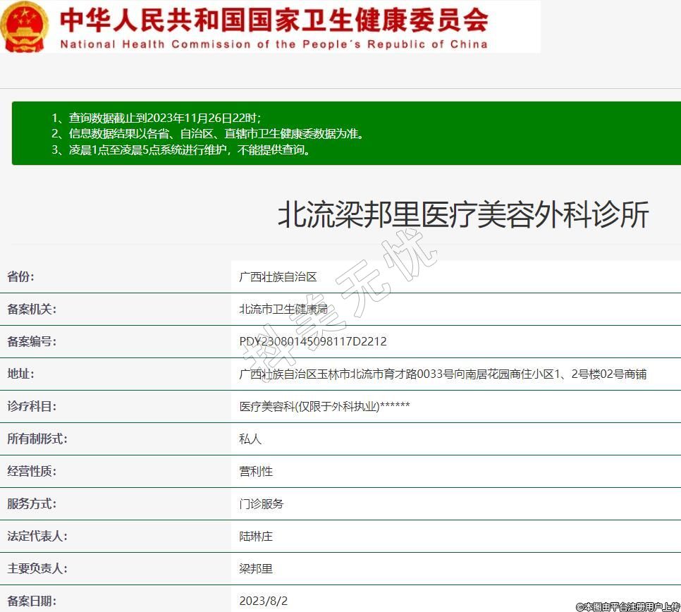 北流梁邦里醫(yī)療美容外科診所,診療科目:醫(yī)療美容科(僅限于外科執(zhí)業(yè))******