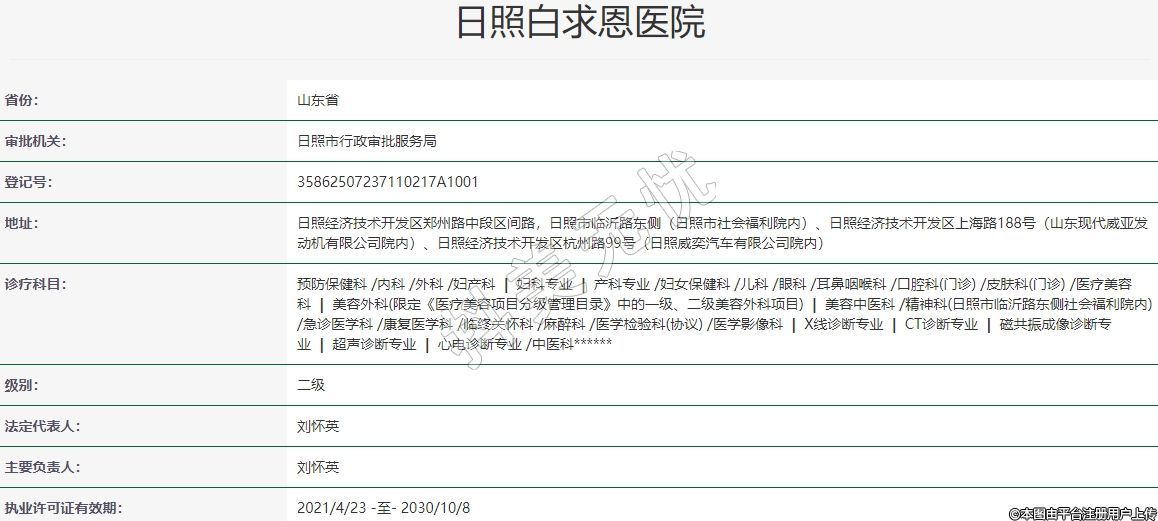 診療科目:預(yù)防保健科 /內(nèi)科 /外科 /婦產(chǎn)科 | 婦科專業(yè) | 產(chǎn)科專業(yè) /婦女保健科 /兒科 /眼科 /耳鼻咽喉科 /口腔科(門診) /皮膚科(門診) /醫(yī)療美容科 | 美容外科(限定《醫(yī)療美容項目分級管理目錄》中的一級、二級美容外科項目) | 美容中醫(yī)科 /精神科(日照市臨沂路東側(cè)社會福利院內(nèi)) /急診醫(yī)學(xué)科 /康復(fù)醫(yī)學(xué)科 /臨終關(guān)懷科 /麻醉科 /醫(yī)學(xué)檢驗科(協(xié)議) /醫(yī)學(xué)影像科 | X線診斷專業(yè) | CT診斷專業(yè) | 磁共振成像診斷專業(yè) | 超聲診斷專業(yè) | 心電診斷專業(yè) /中醫(yī)科******