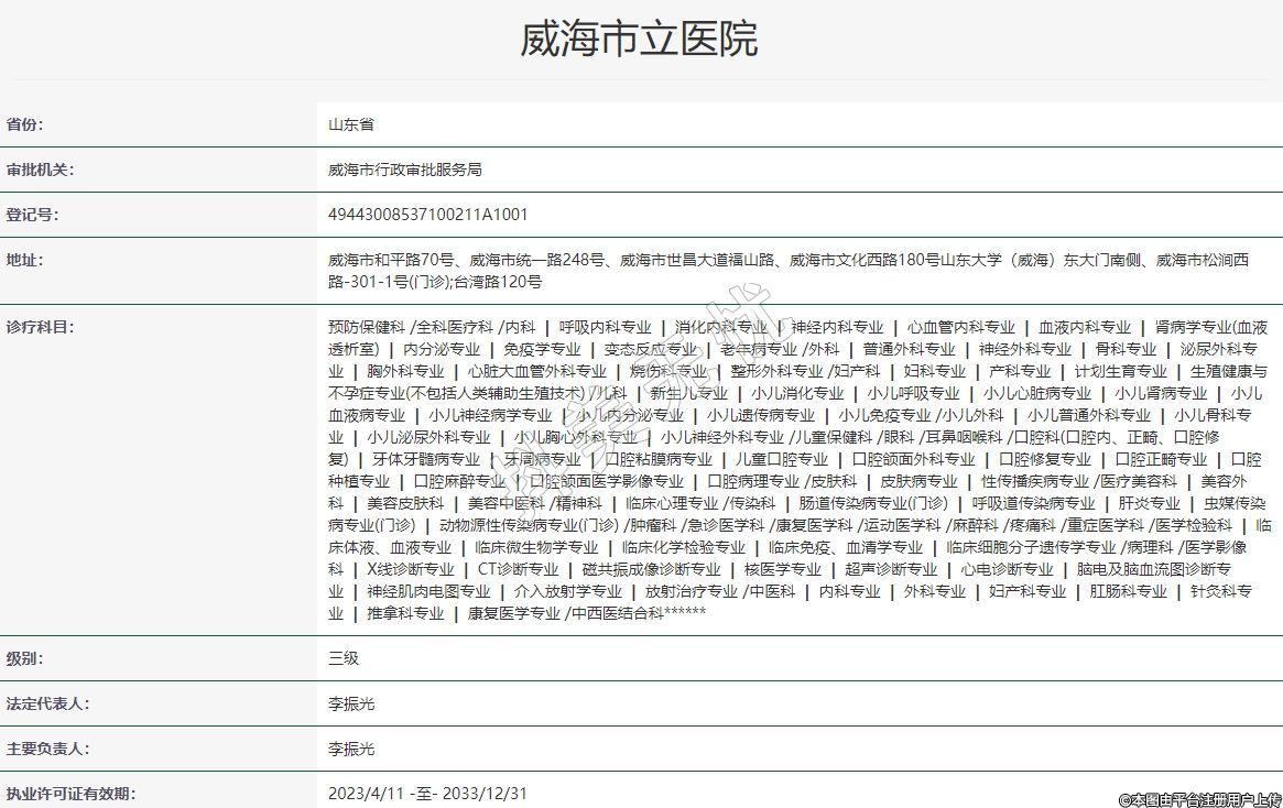 地址:威海市和平路70號(hào)、威海市統(tǒng)一路248號(hào)、威海市世昌大道福山路、威海市文化西路180號(hào)山東大學(xué)(威海)東大門南側(cè)、威海市松澗西路-301-1號(hào)(門診);臺(tái)灣路120號(hào)