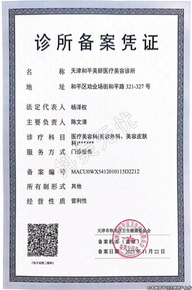 天津和平美妍醫(yī)療美容診所,診療科目:醫(yī)療美容科(美容外科、美容皮膚科)******
